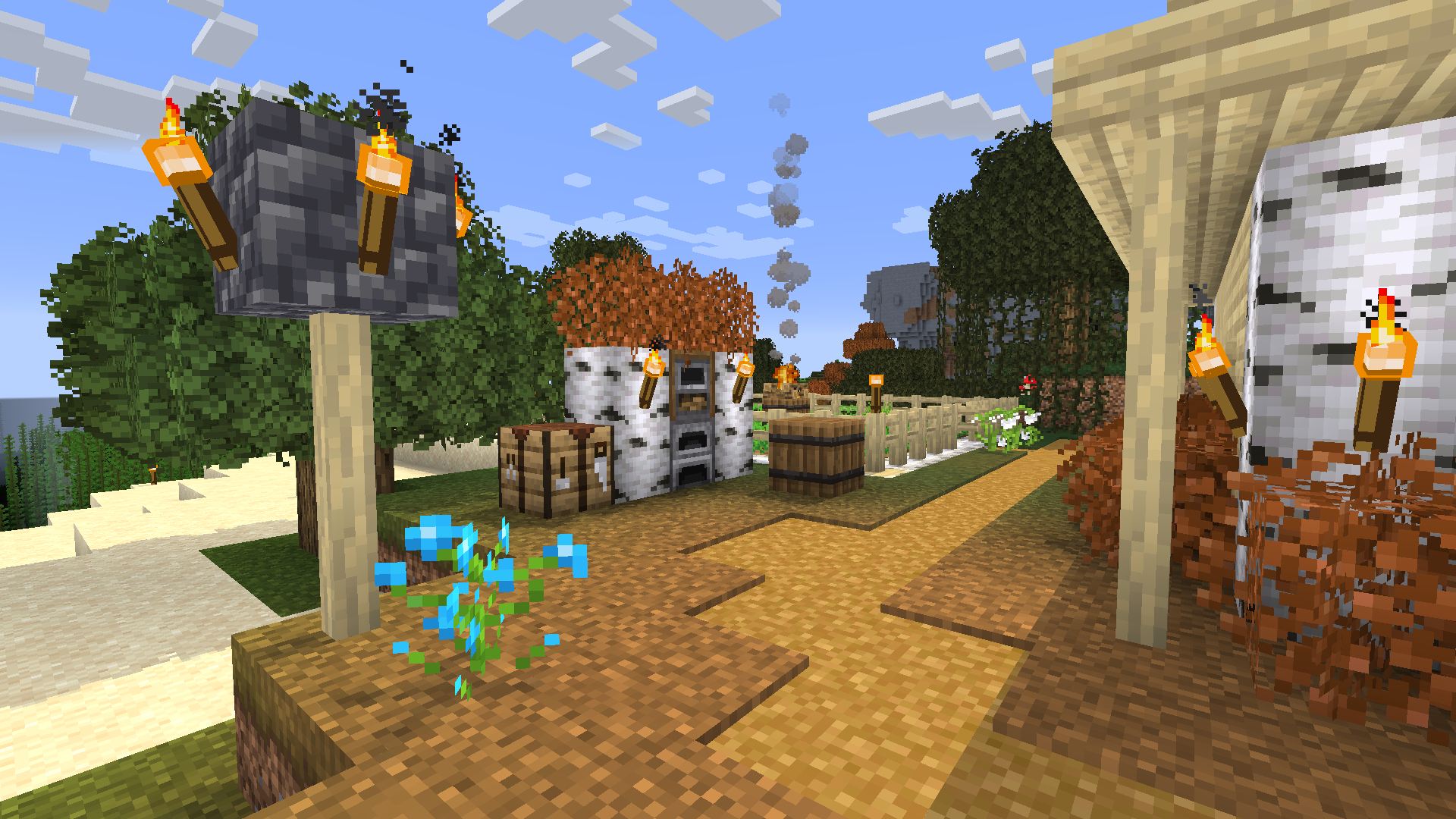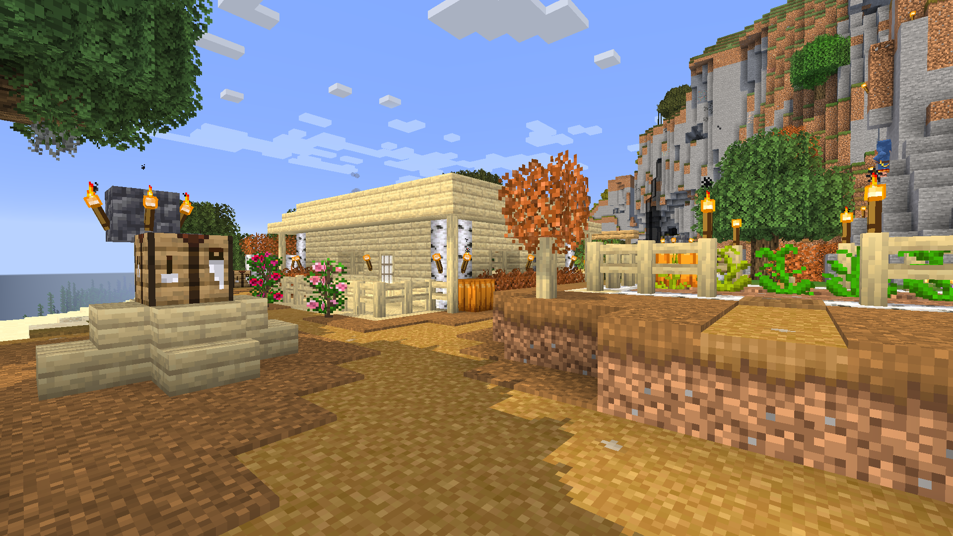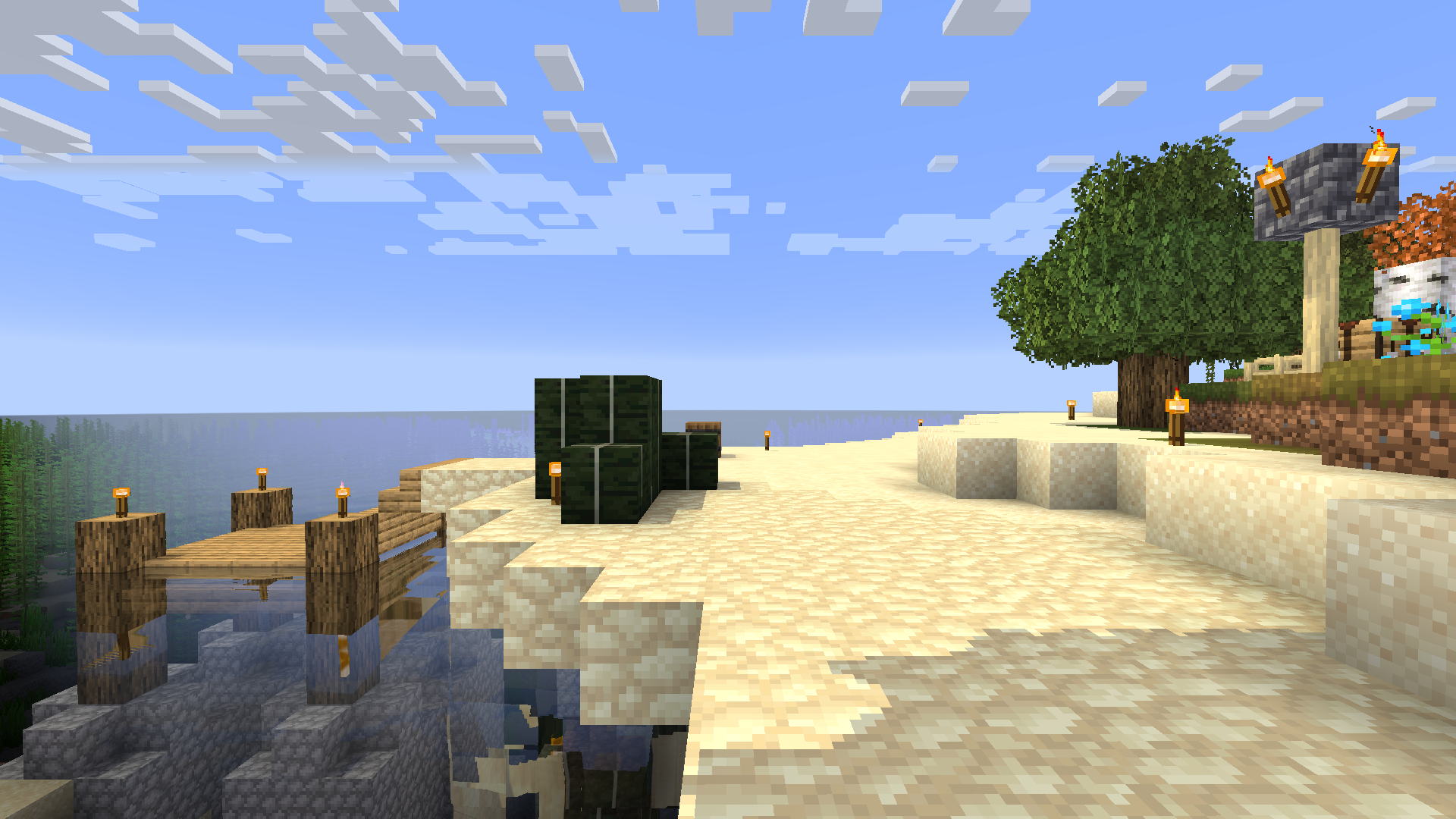 We landed at a typical birch forest and quickly gathered materials for a communal house to settle the immediate area. Early food sources were kelp and potatoes obtained from a nearby village. Besides the ocean and a couple of mountains, surrounding biomes were little more than woods and plains. We started building close to the shore near the landing site.