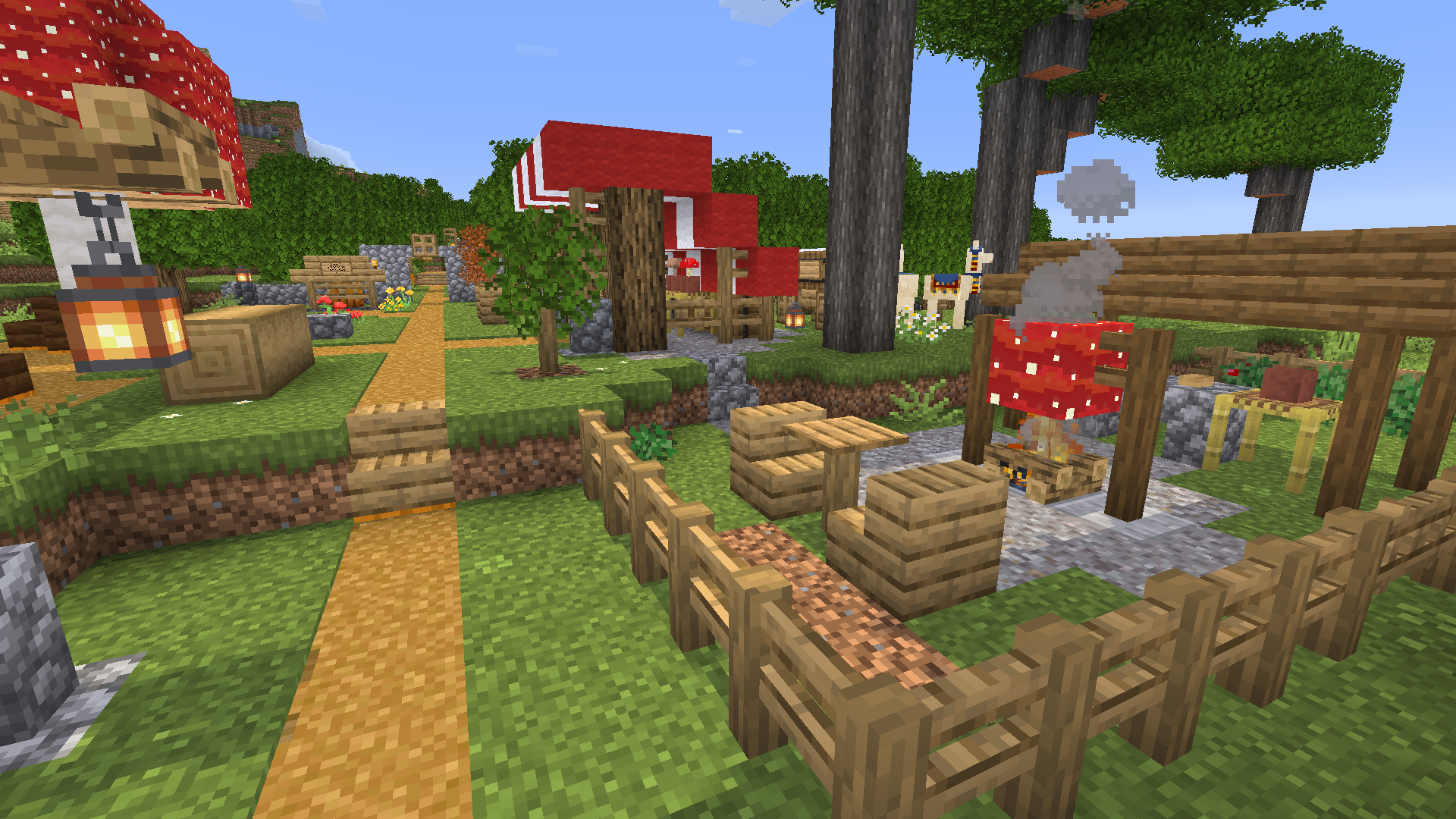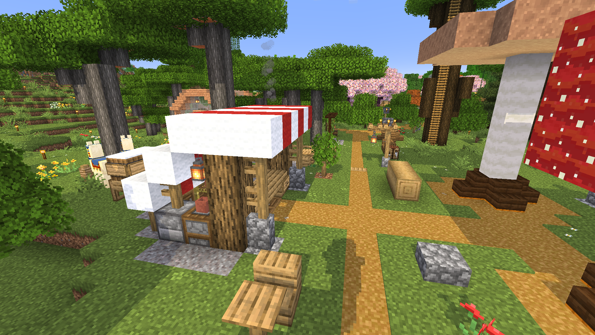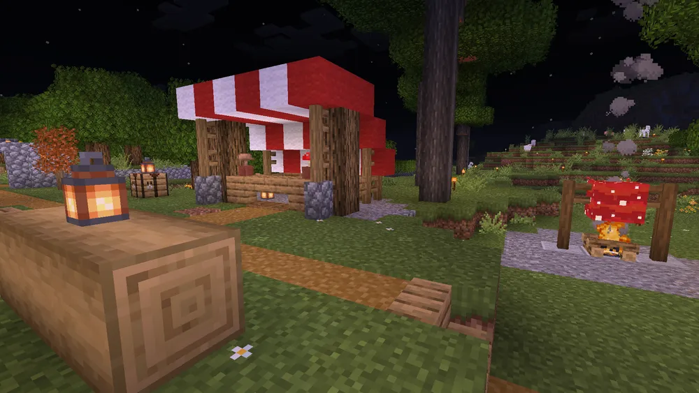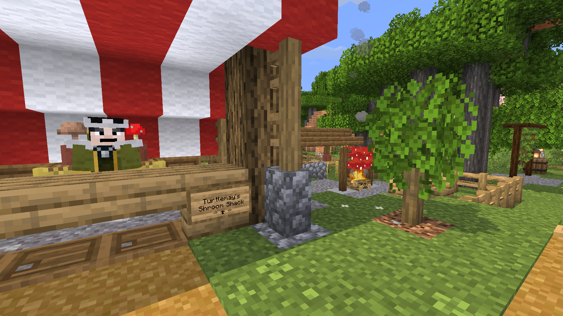 A mushroom vendor booth serves the road to downtown Pepperton, supplied by the giant mushroom farm.